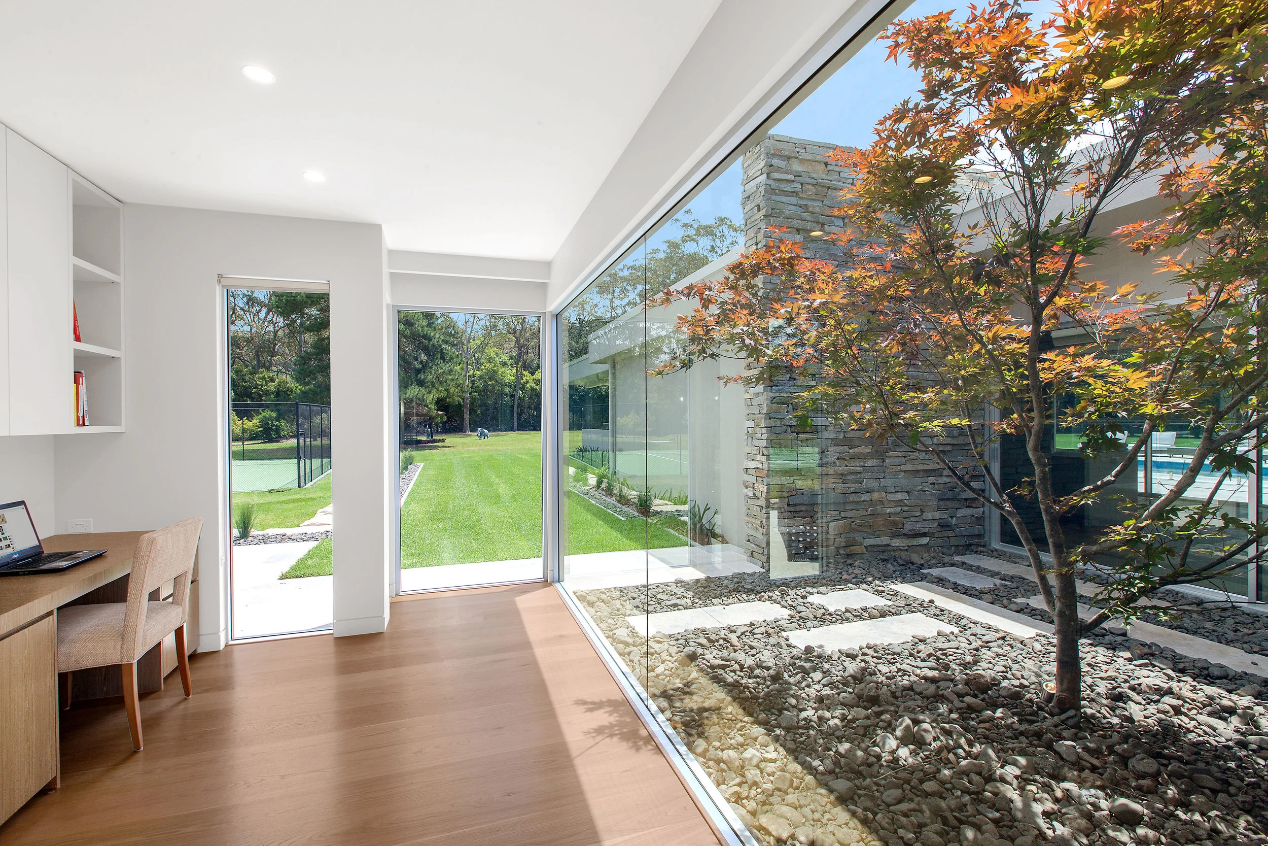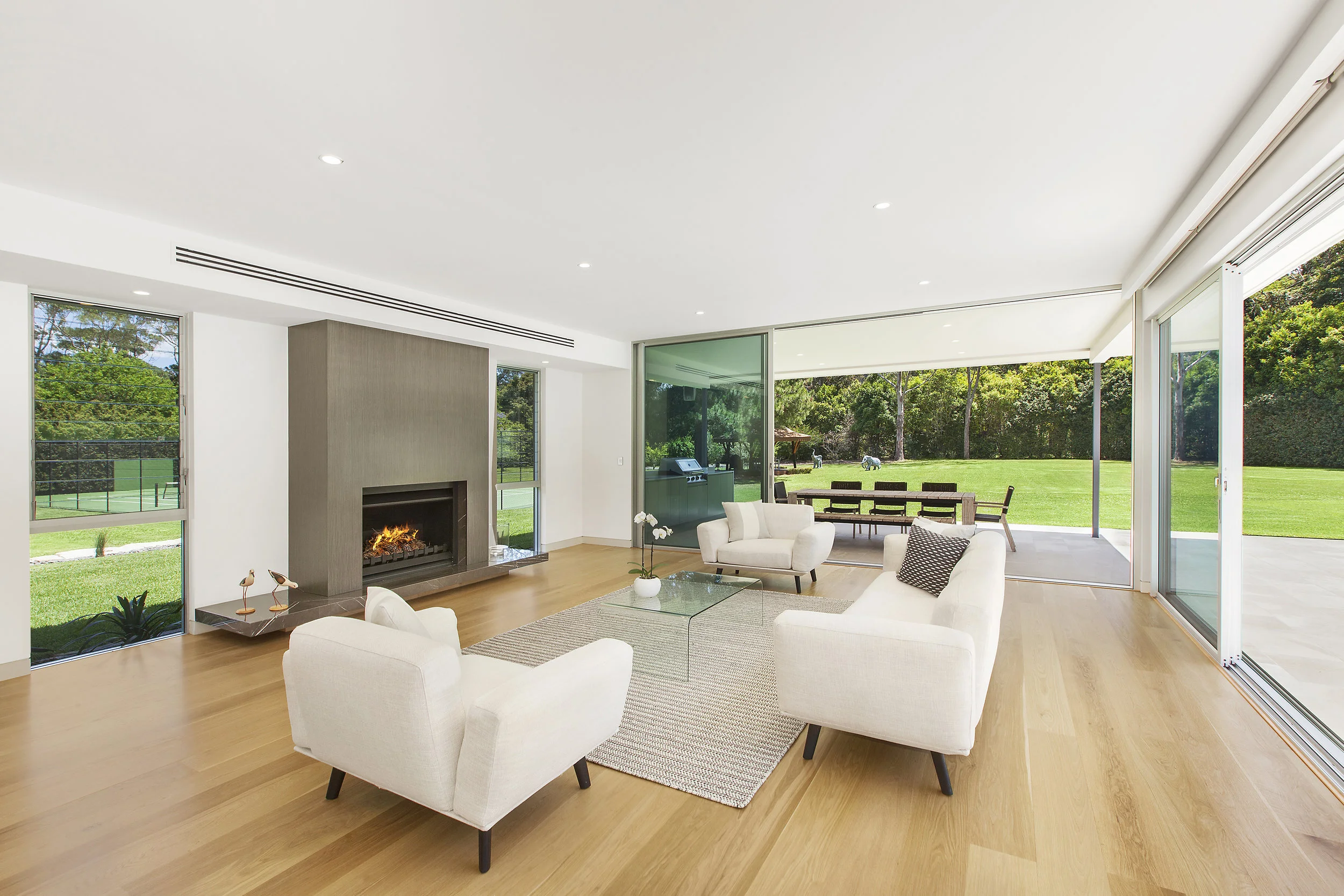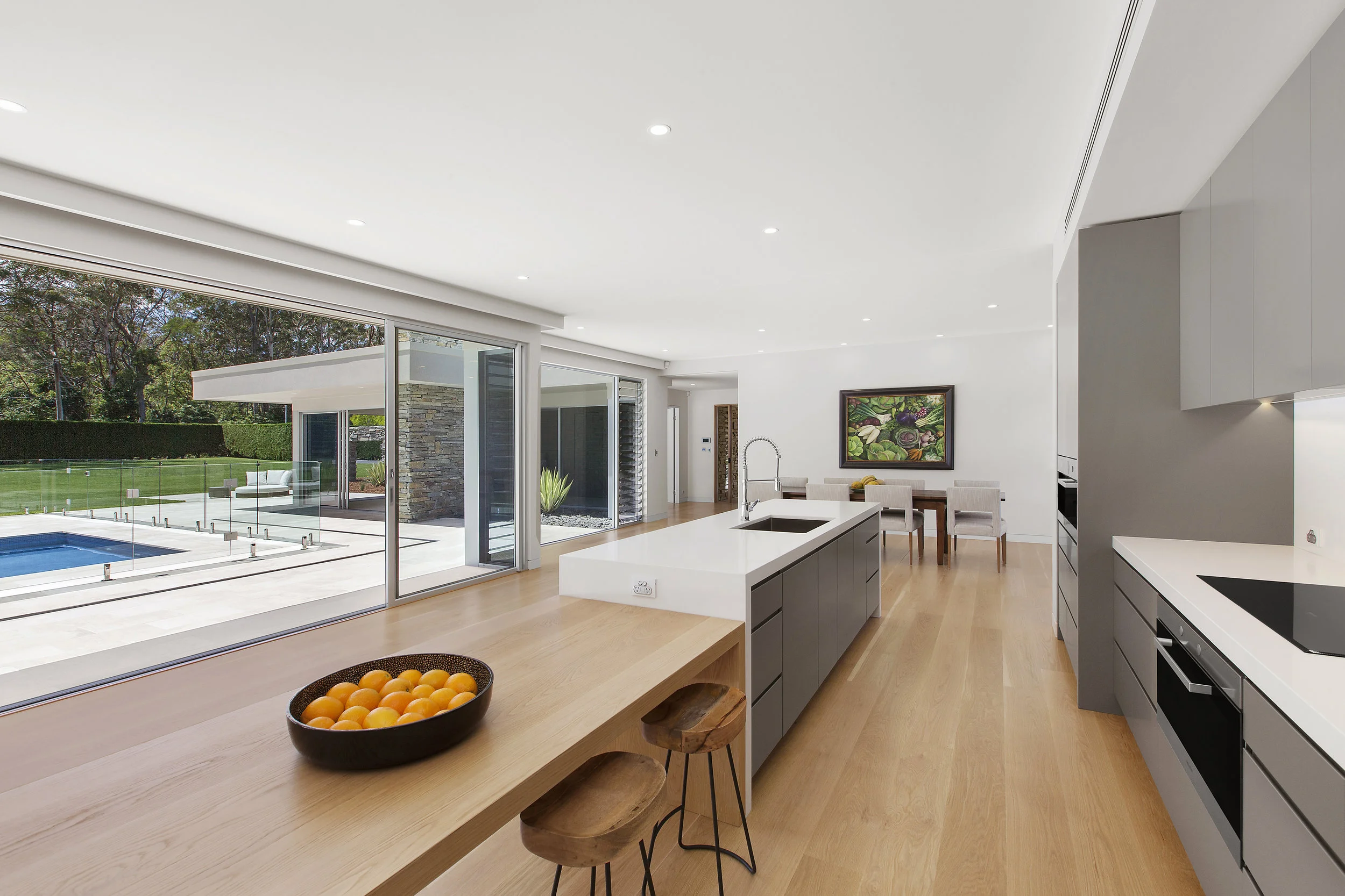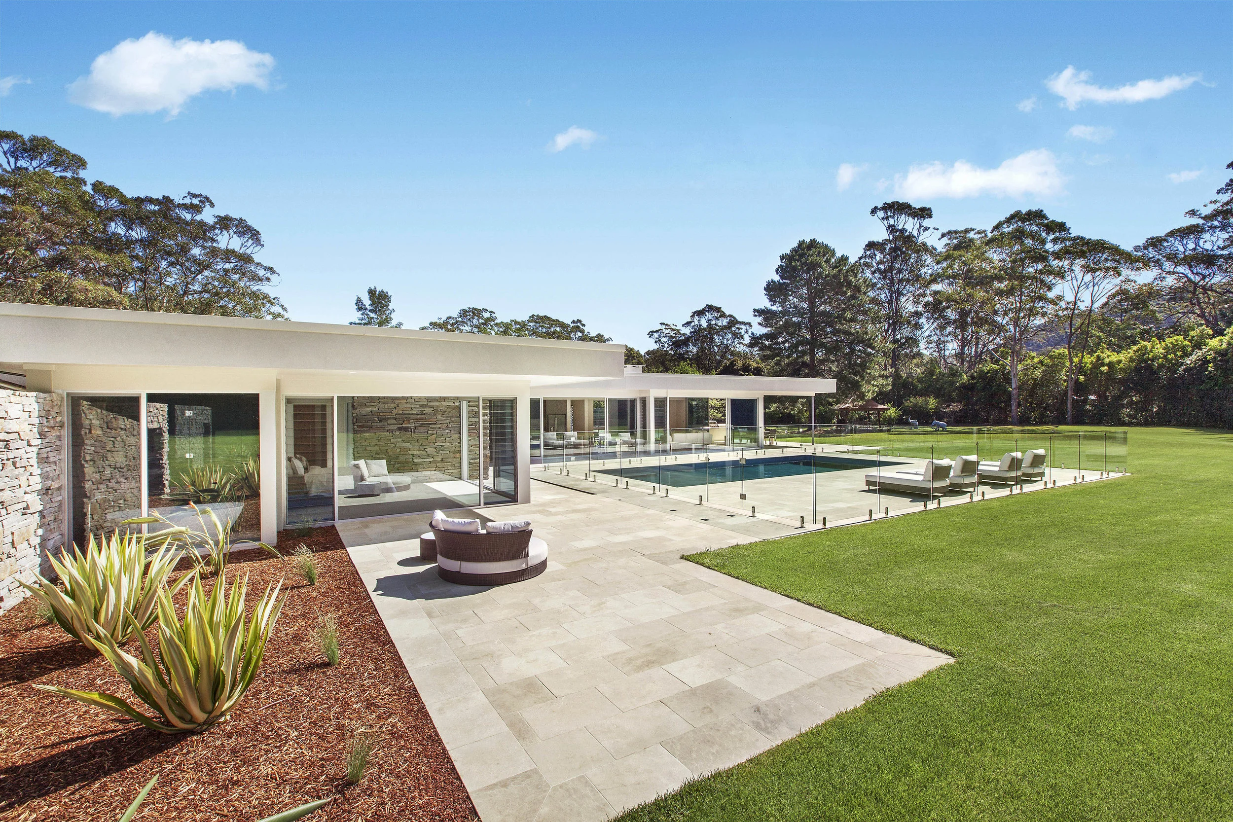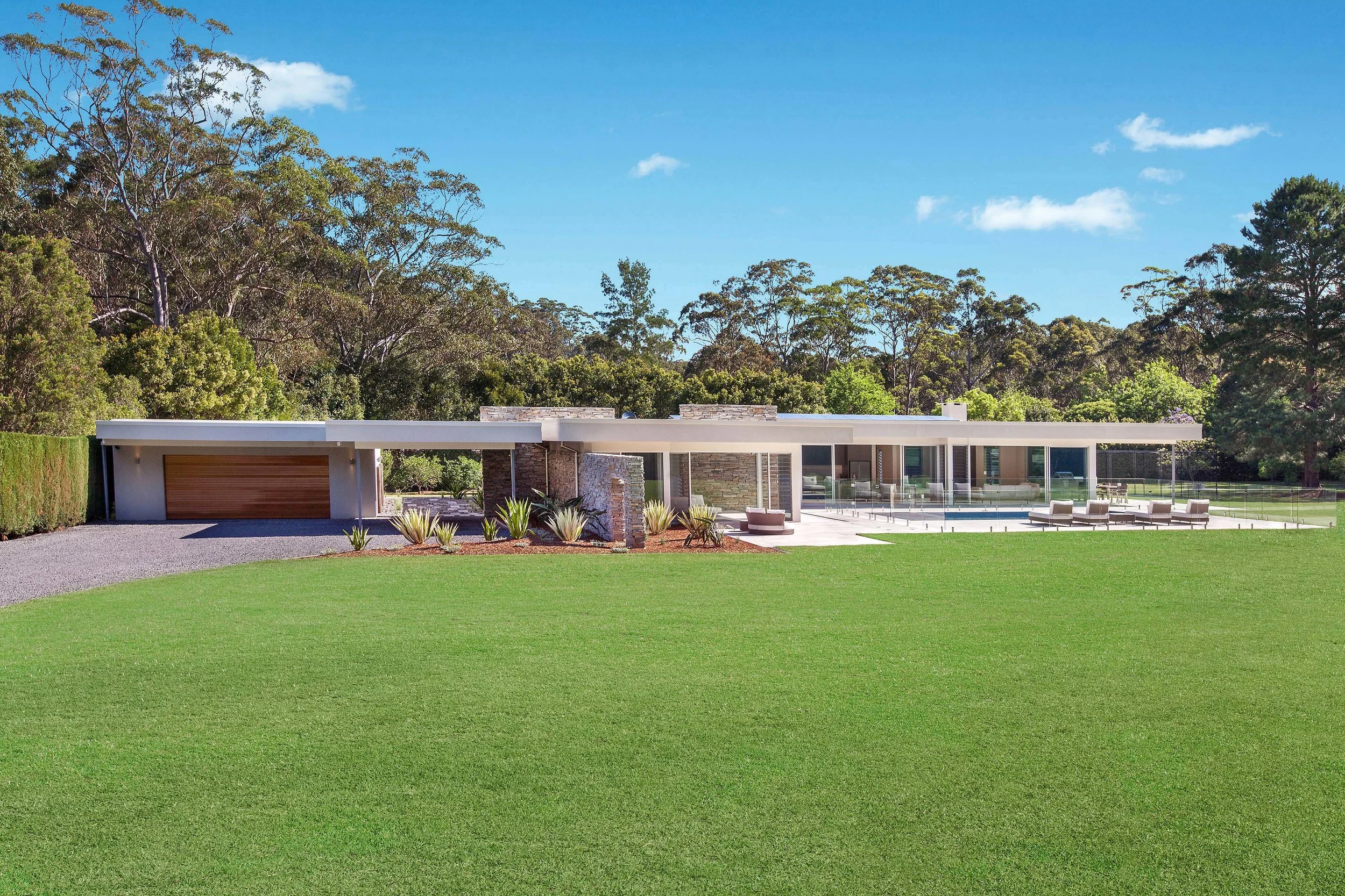 Inspired by the iconic Mid Century Modernist homes of Palm Springs, this coastal acreage exudes sophistication and elegance. With manicured lawns and complete privacy, connection to the land was paramount. The orientation allows for the pool area to be bathed in Northern sun all day and all the living areas and main bedroom take advantage of the spectacular outlook.